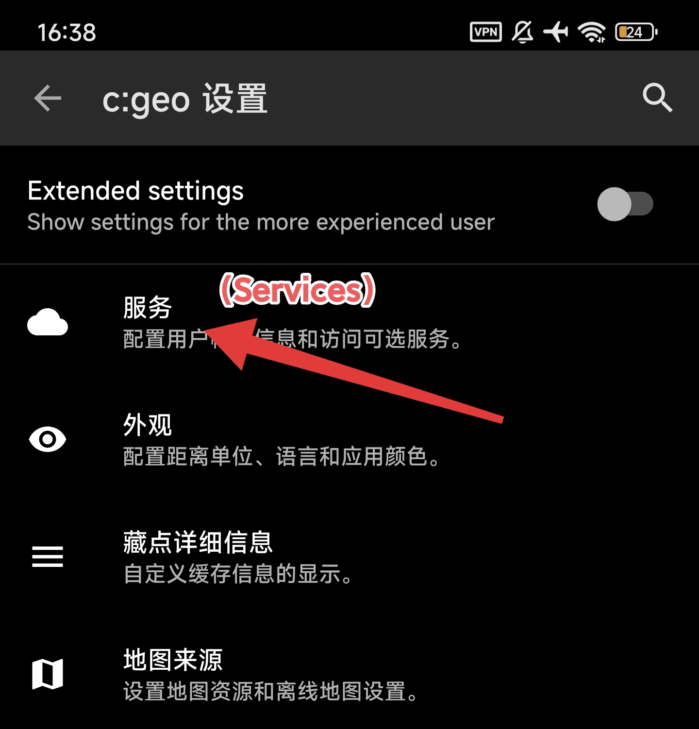 安装后打开 c:geo,将底部导航切换到 首页 (Home)。点击右上角的三个点,在下拉菜单中选择 设置 (Settings)。