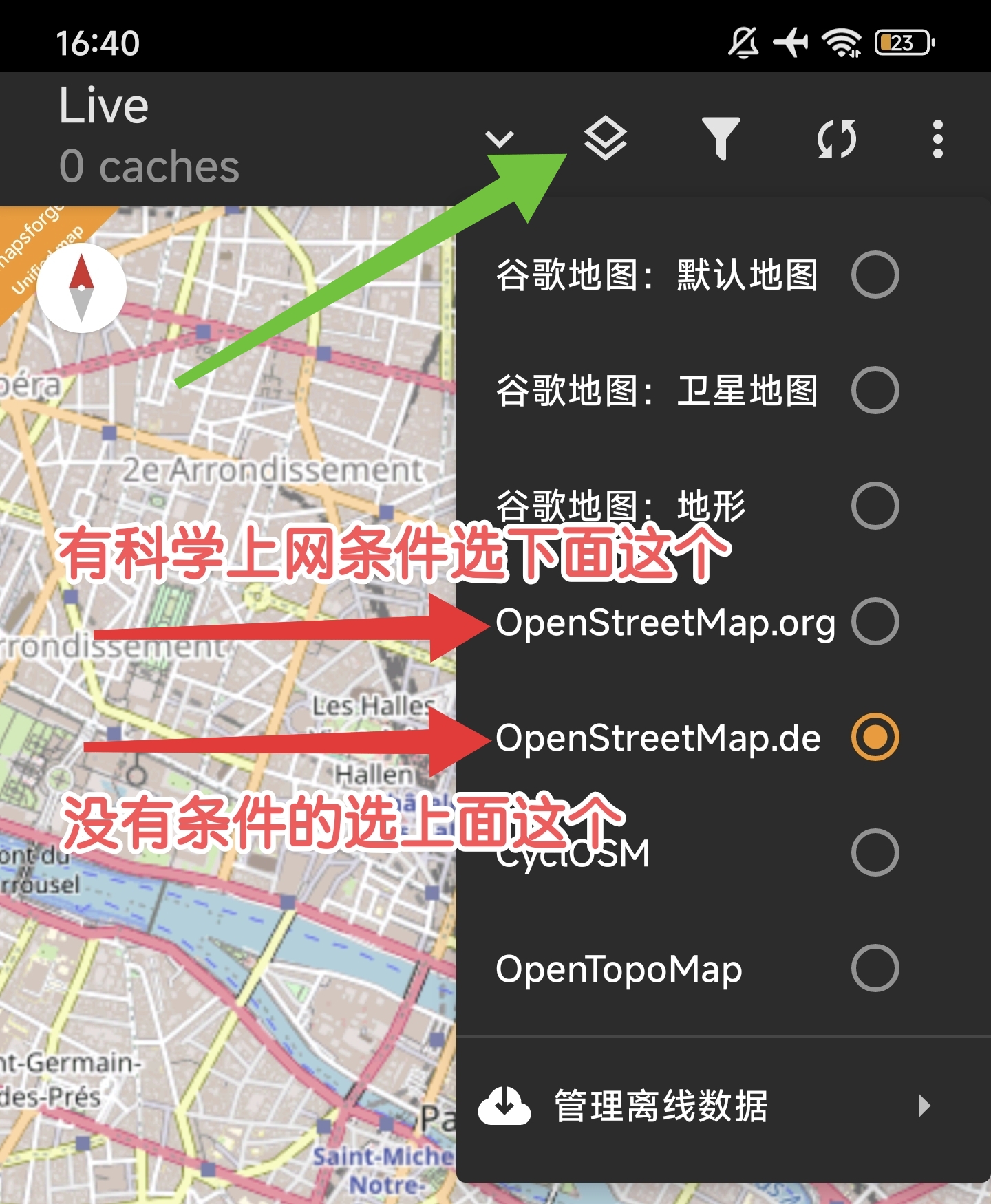 登录成功后,将底部导航切换到 地图 (Map)。点击右上角的「切换地图」的图标,在弹出的地图列表中选择 OpenStreetMap.de(如果有科学上网条件,也可以选择 OpenStreetMap.org)。