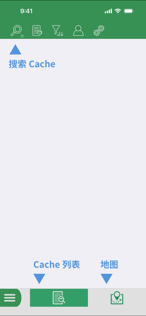 由于一开始并未搜索任何 Cache,因此列表地图中均无 Cache 展示。