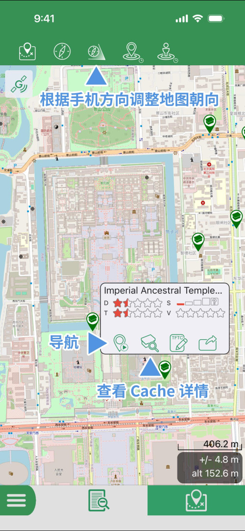 在地图模式下,上方第三个按钮可以切换到根据手机方向调整地图的上方朝向。这在精确导航中非常有用,如果你在 Cache 附近,这一功能可以把你带到 Cache 的准确位置。