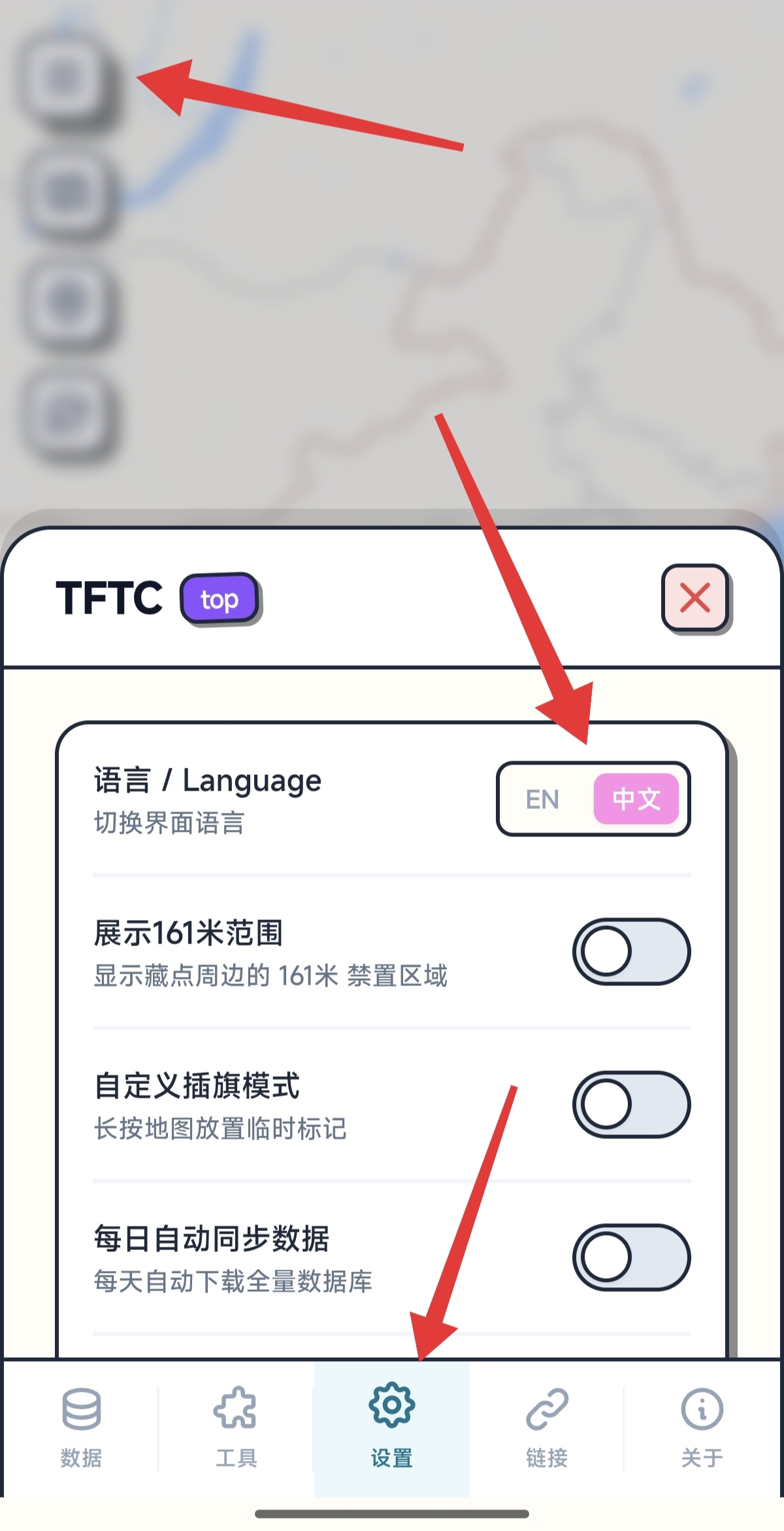 tftc.top 使用指南¶ tftc.top 是一个由热心宝友开发的第三方寻宝地图网站,提供了一个简洁易用的界面,帮助国内玩家在手机上查看附近的藏宝点信息。 默认情况下,页面只会显示最近 10 天内新增的藏宝点。 如何设置语言为中文¶ 在页面左上角点击三条线按钮,在菜单中找到设置项,将语言切换为中文即可。 如何查看附近的藏宝点¶ 开启页面左上角的两个按钮,然后把地图放大并移动到你所在位置附近,即可看到周边藏宝点。点击藏宝点图标可查看详细信息。
